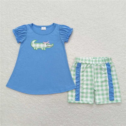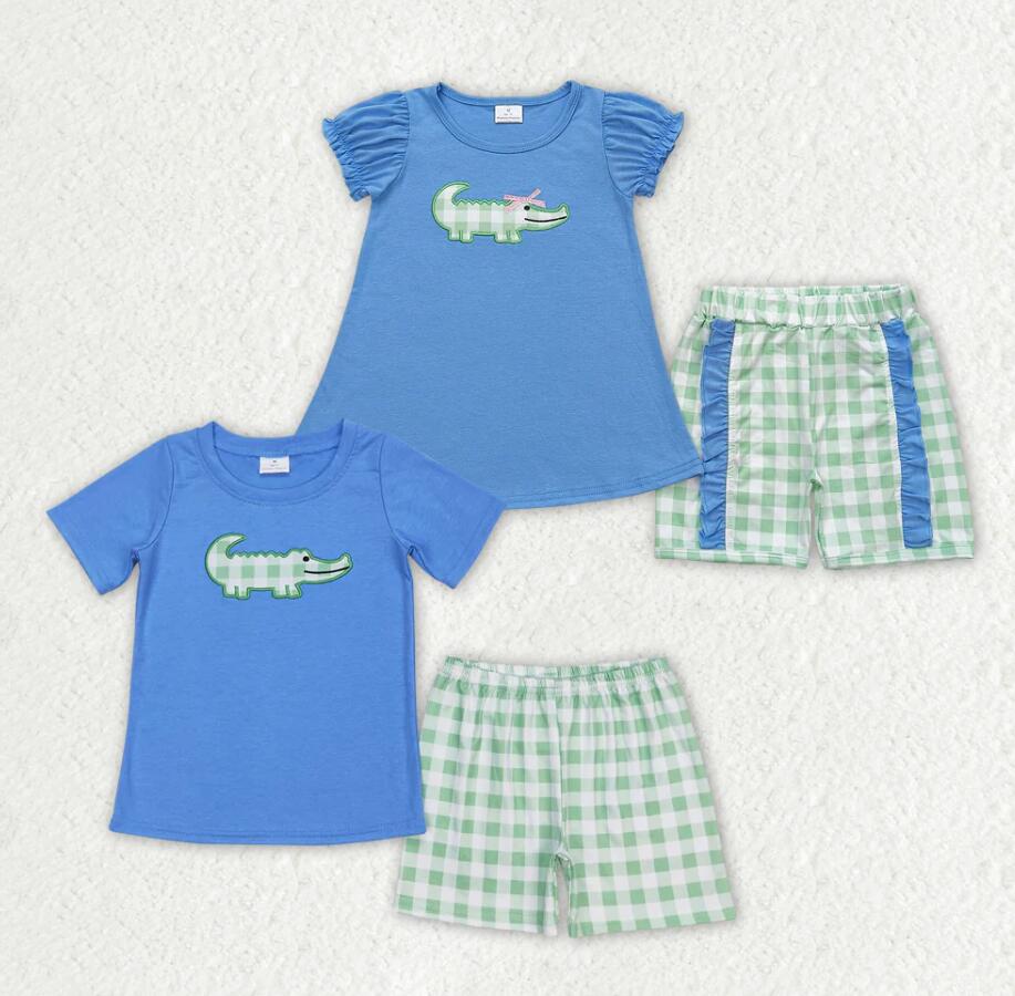 Baby Girls Crocodile Shirt Green Checkered Sibling Shorts Clothes Sets