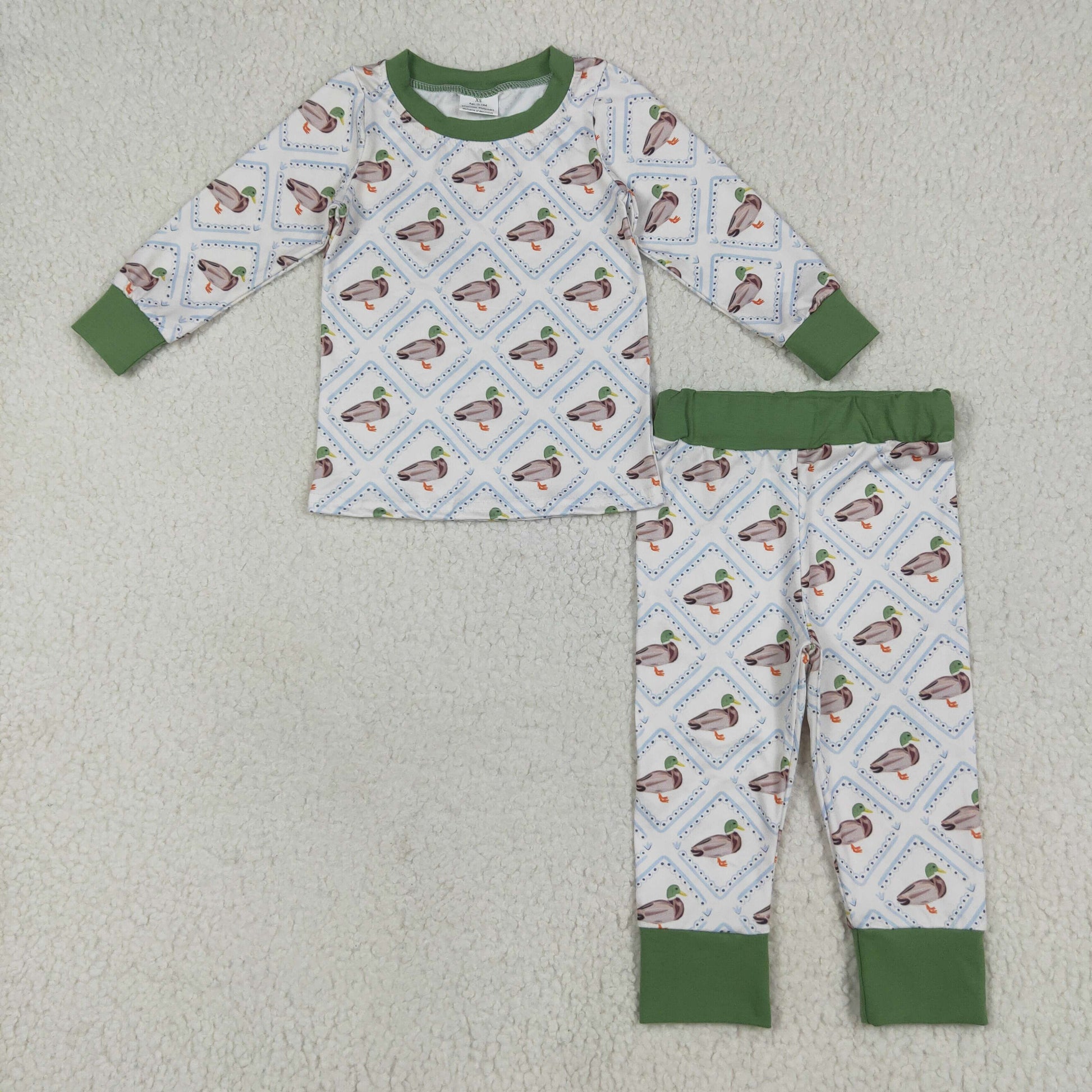 BLP1086 Baby Boys Long Sleeves Green Ducks Plaid Top Pant Pajamas Set 6.24