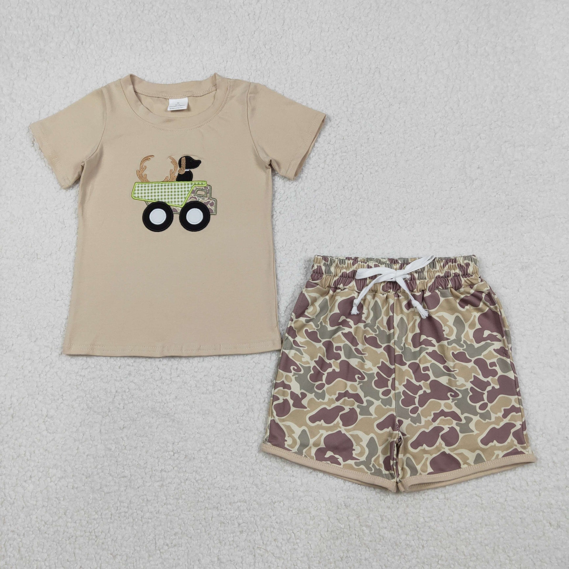 BSSO1576 Embroidery Embroidery Deer Truck Baby Boys Khaki Top Camo Shorts Hunting Clothes Set C12.8