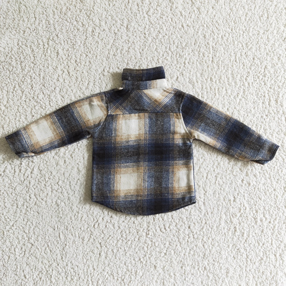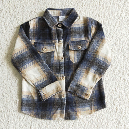 BT0117 Boys Blue Black Plaid Pockets Flannel Button Shirt