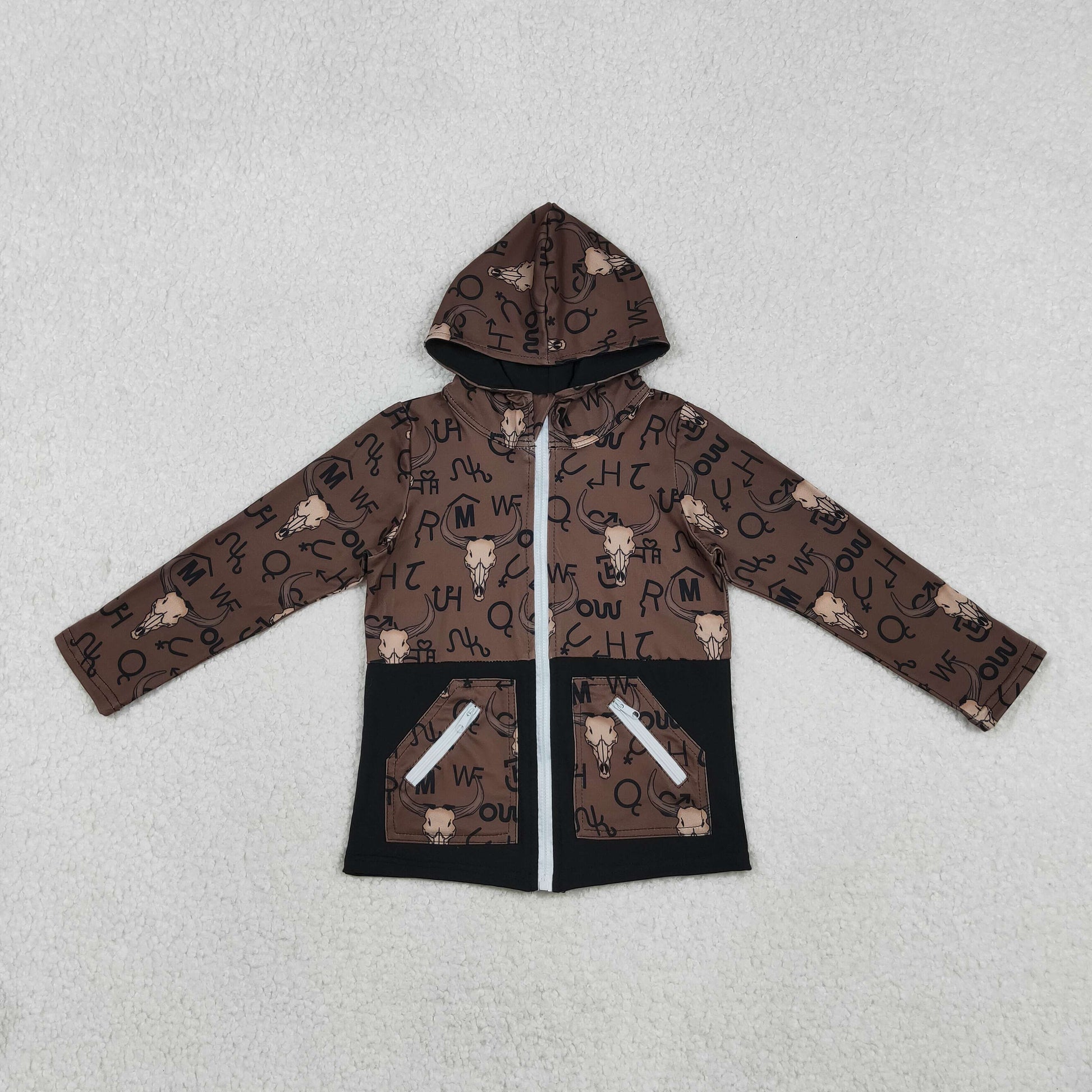 BT1337 Baby Boys Brown Bull Skulls Pocket Zipper Western Hoodies Top C11.12
