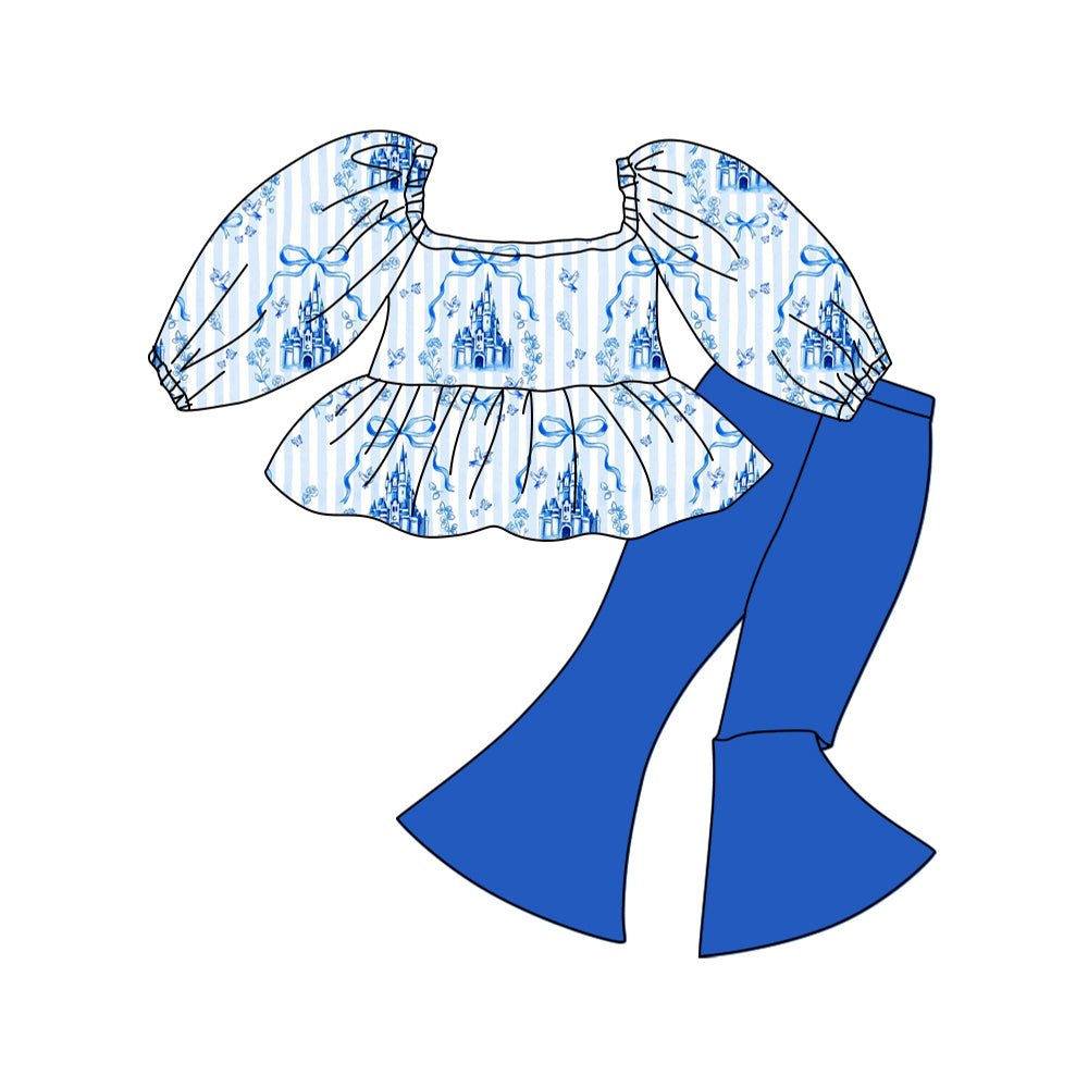 C12.12 GLP3283 Baby Girls Blue Stripe Bows Castles Tunic Bell Bottom Pants Clothes Sets Preorder