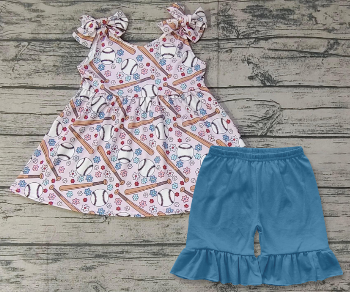 Girls Baseball Suspenders Blue Shorts Set