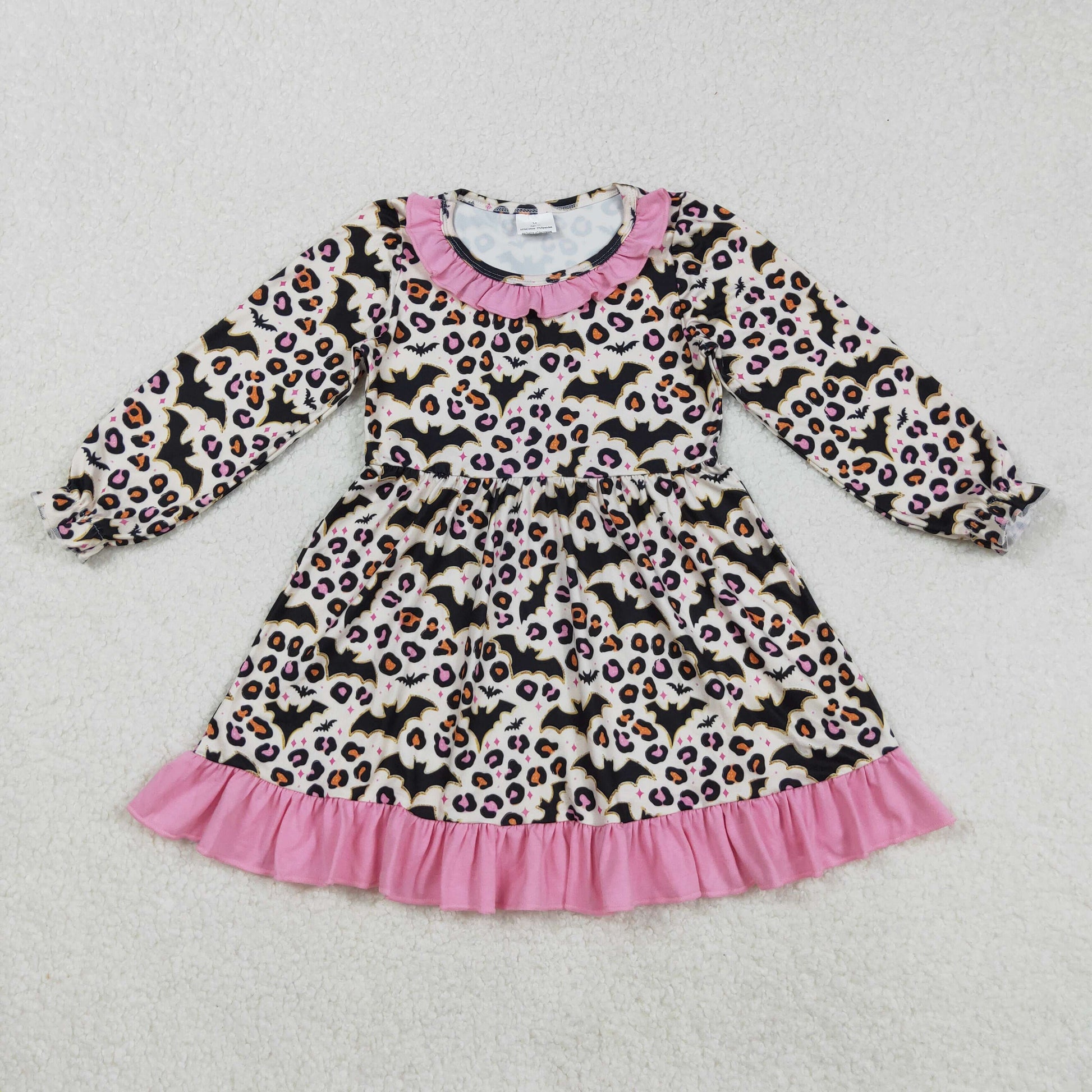 GLD1224 Baby Girls Long Ruffle Sleeves Leopard Bats Plaid Knee Length Dress C9.1