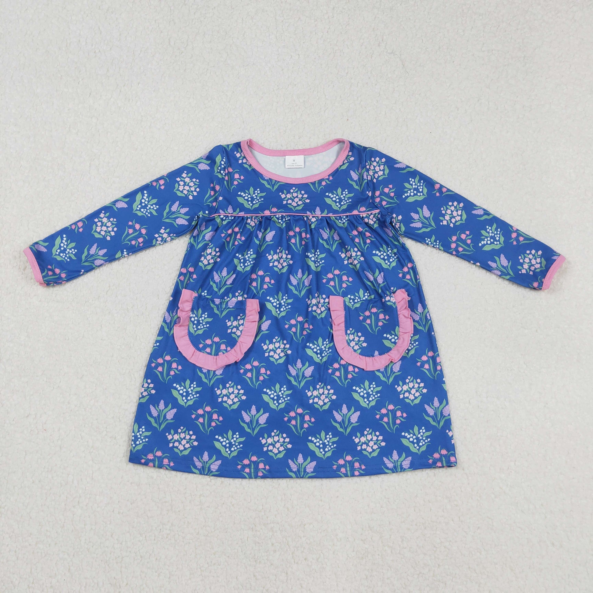 GLD1257 Baby Girls Blue Flowers Plaid Pockets Knee Length Dress C9.3