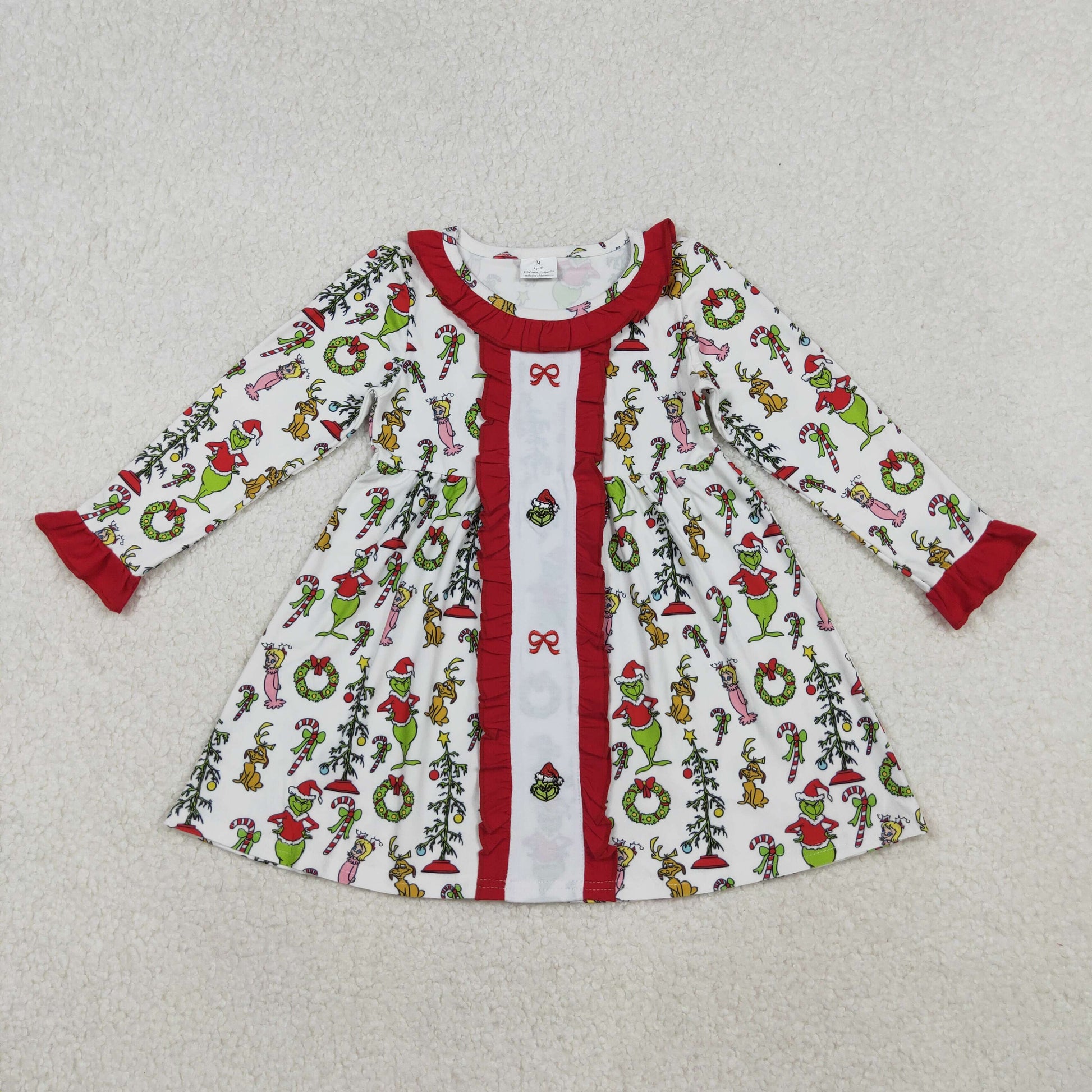 GLD1289 Embroidery Baby Girls Green Face Miss Bows Christmas Knee Length Dress C10.16