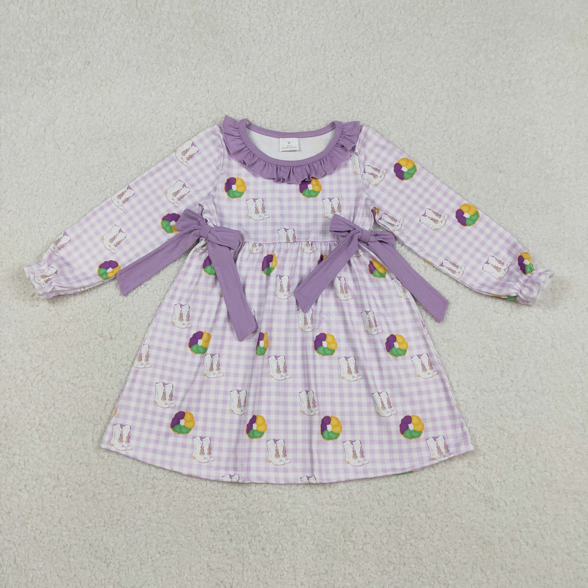 GLD1379 Baby Girls Purple Checked Boots Donuts Bows Mardigras Knee Length Dress C12.12