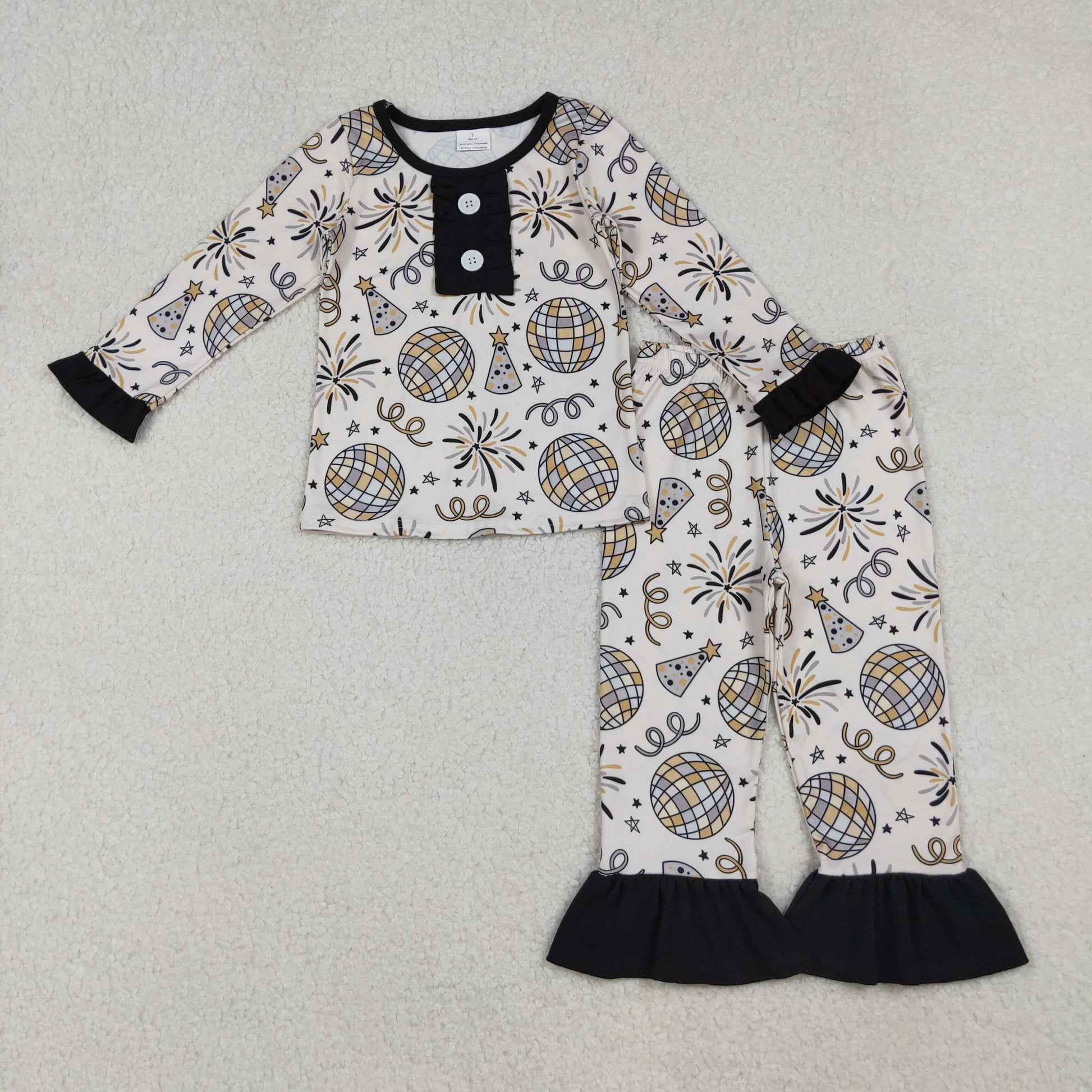 GLP2563 Baby Girls Long Ruffle Sleeves Birthday's Hats Button Top Pant Pajamas Set C10.8