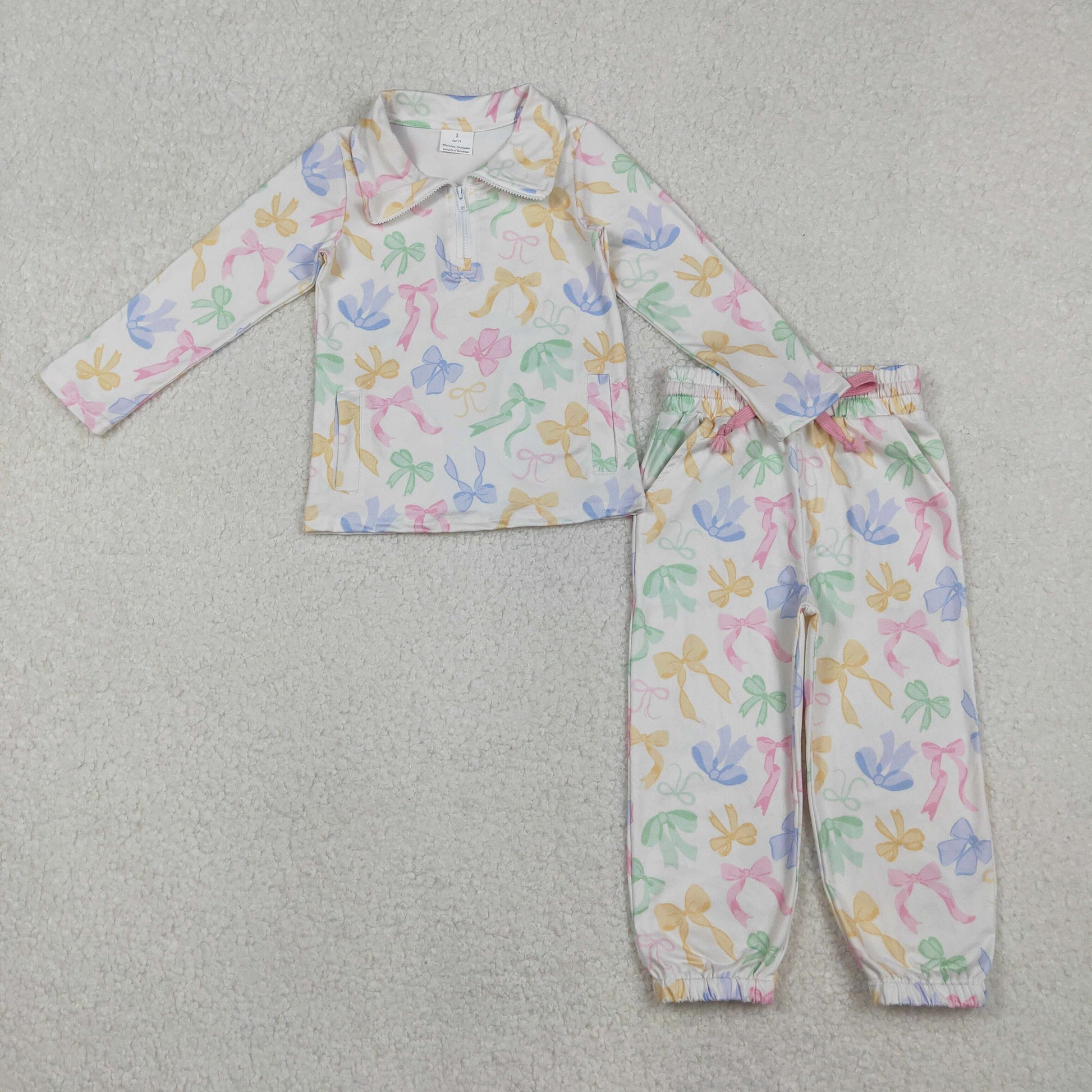 GLP2886 Baby Girls Colorful Bows Pockets Zipper Pullover Jogger Clothes Set C10.28