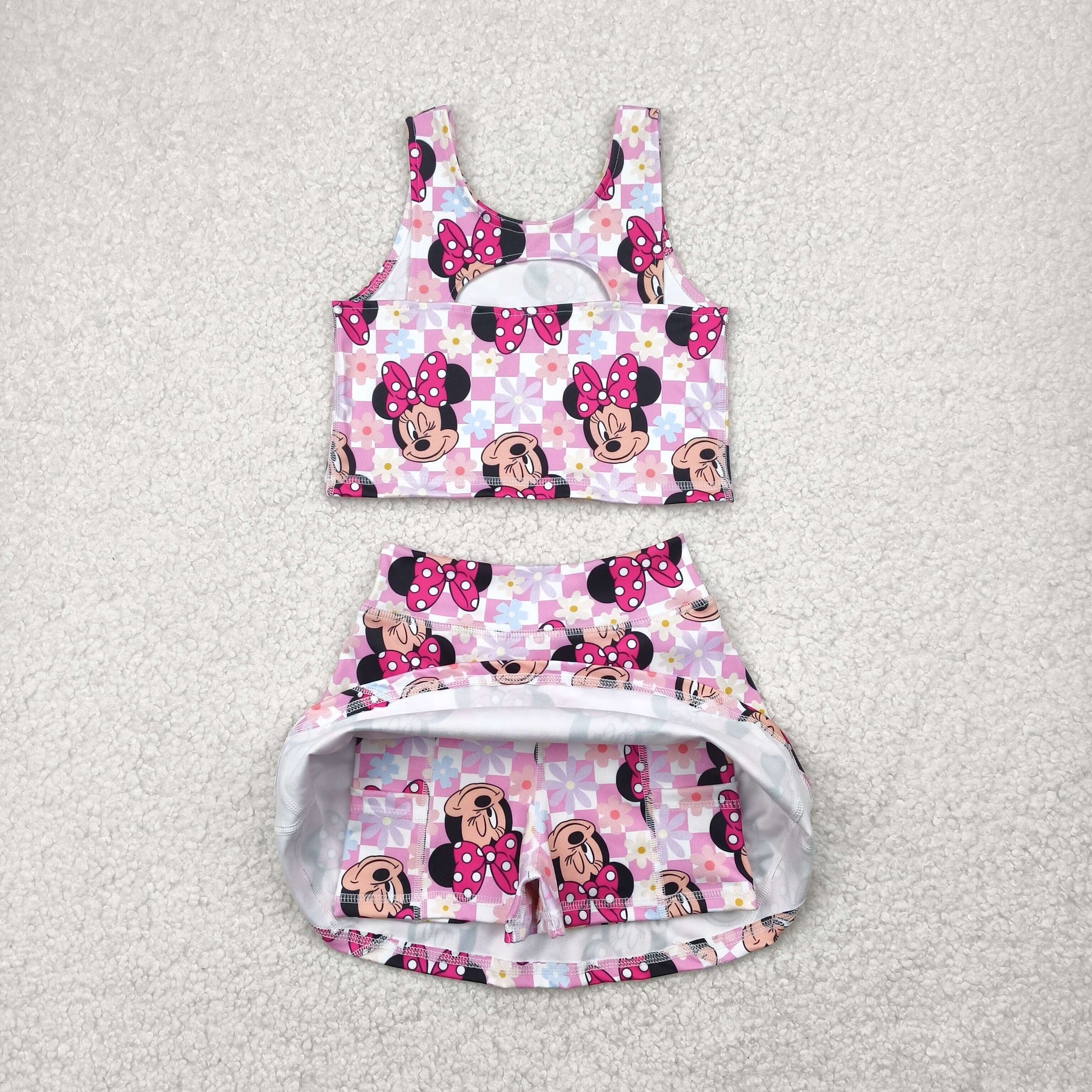 GSD2460 Baby Girls Sleeveless Pink Plaid Cartoon Mouse Top Skort Yoga Set 4.29