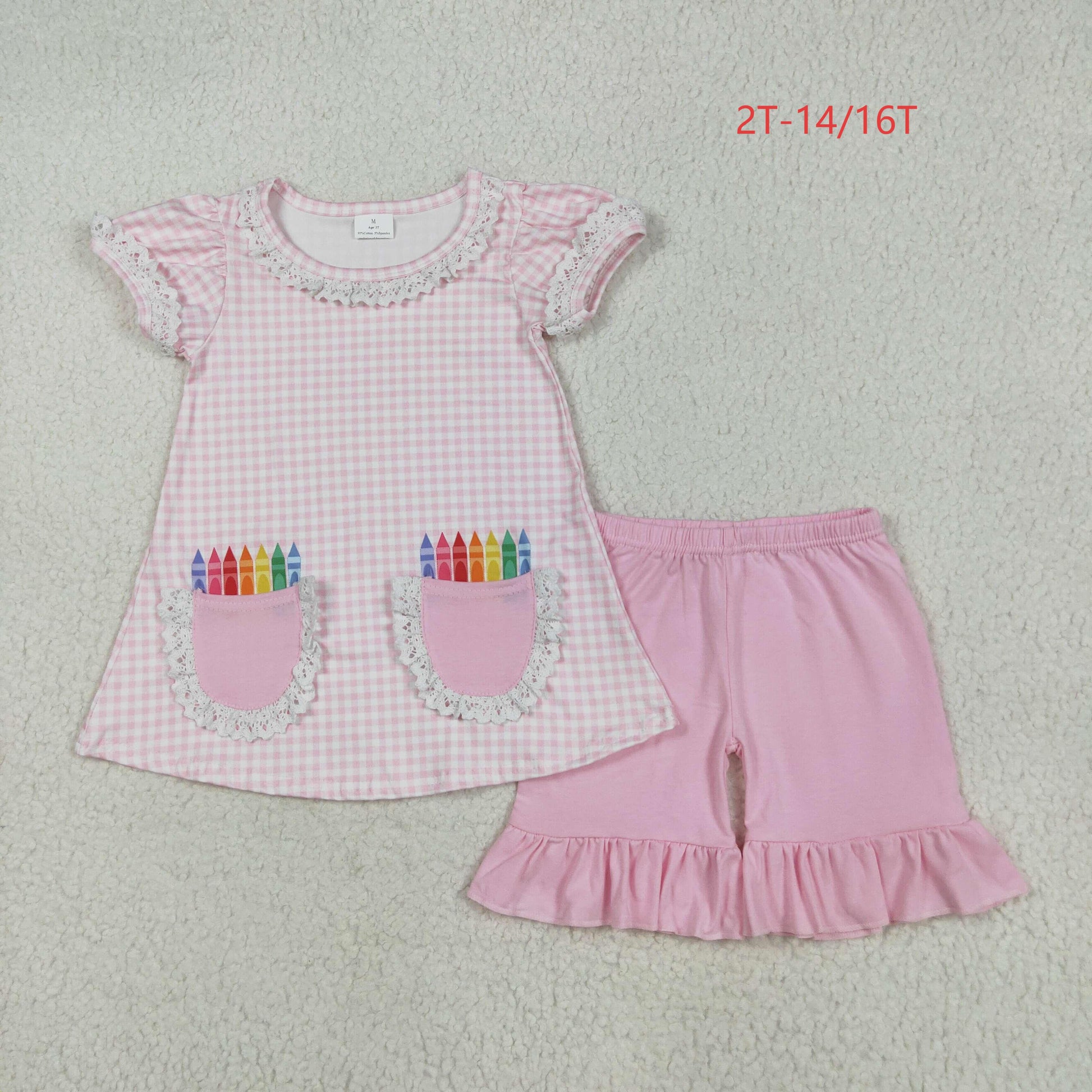 GSSO2388 Baby Girls Pink Plaid Pencils Pockets Tunic Ruffle Short Set 5.22