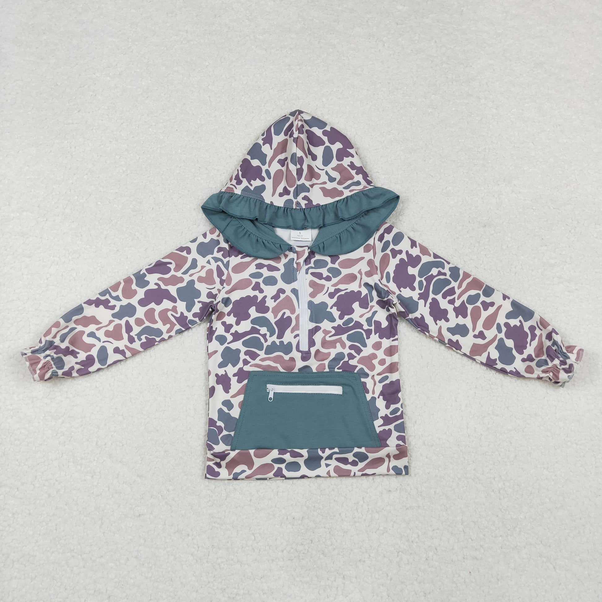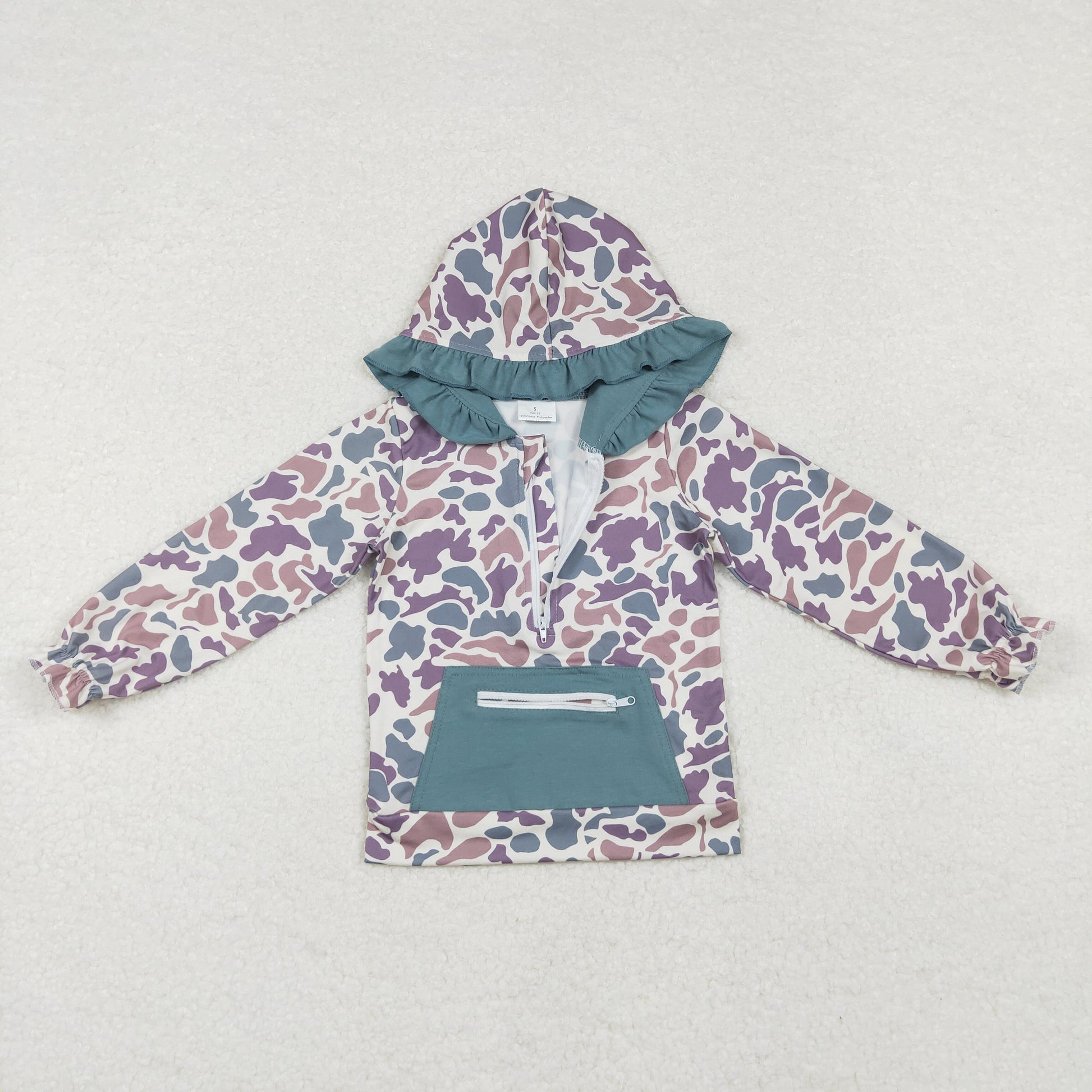 GT0629 Baby Girls Green Ruffle Camo Hunting Hooded Long Sleeve Zip Jackets Tops