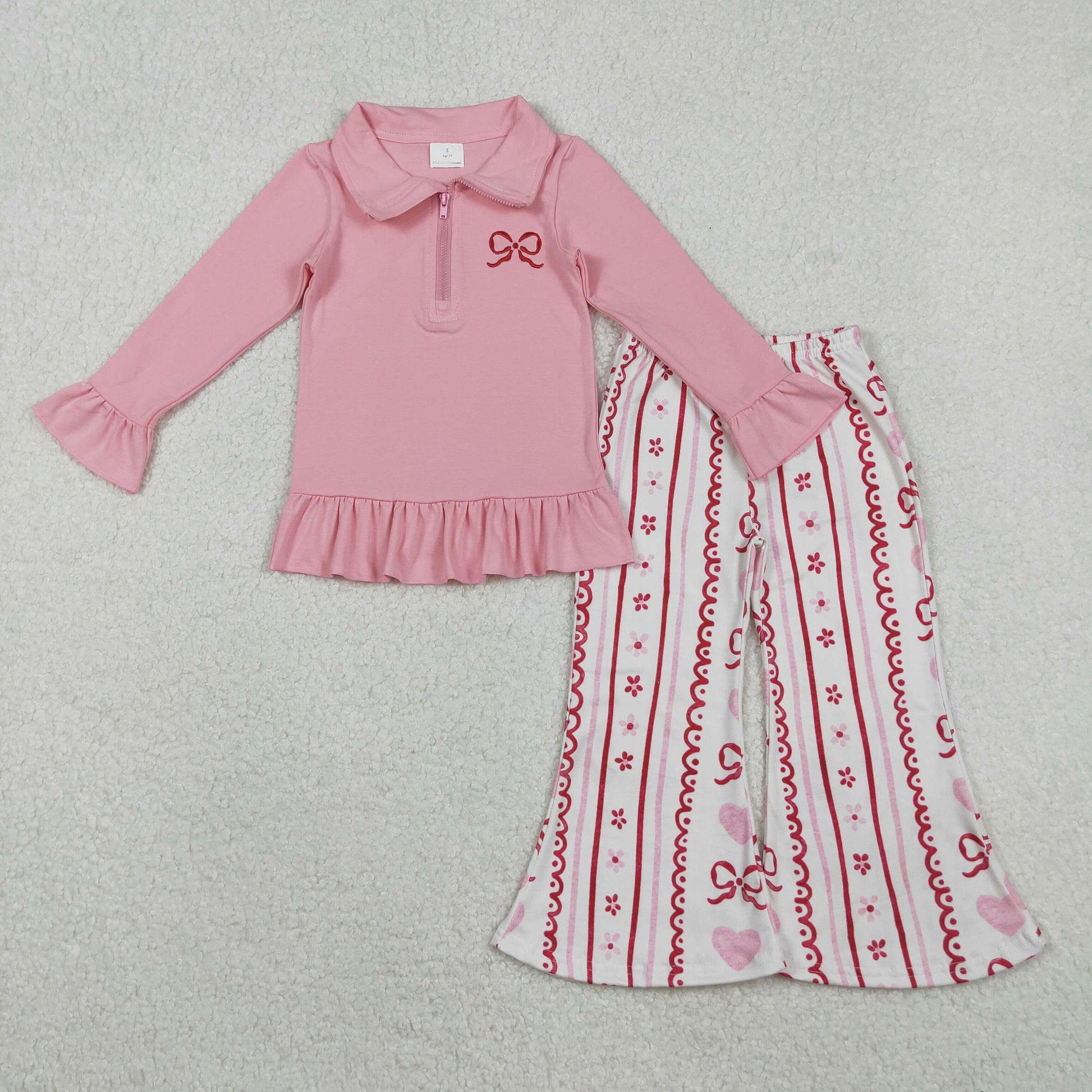 GT1270+P0894 Embroidery Bow Baby Girls Pink Zipper Pullovers Stripe Bell Bottom Pants Valentines Clothes Set C11.20