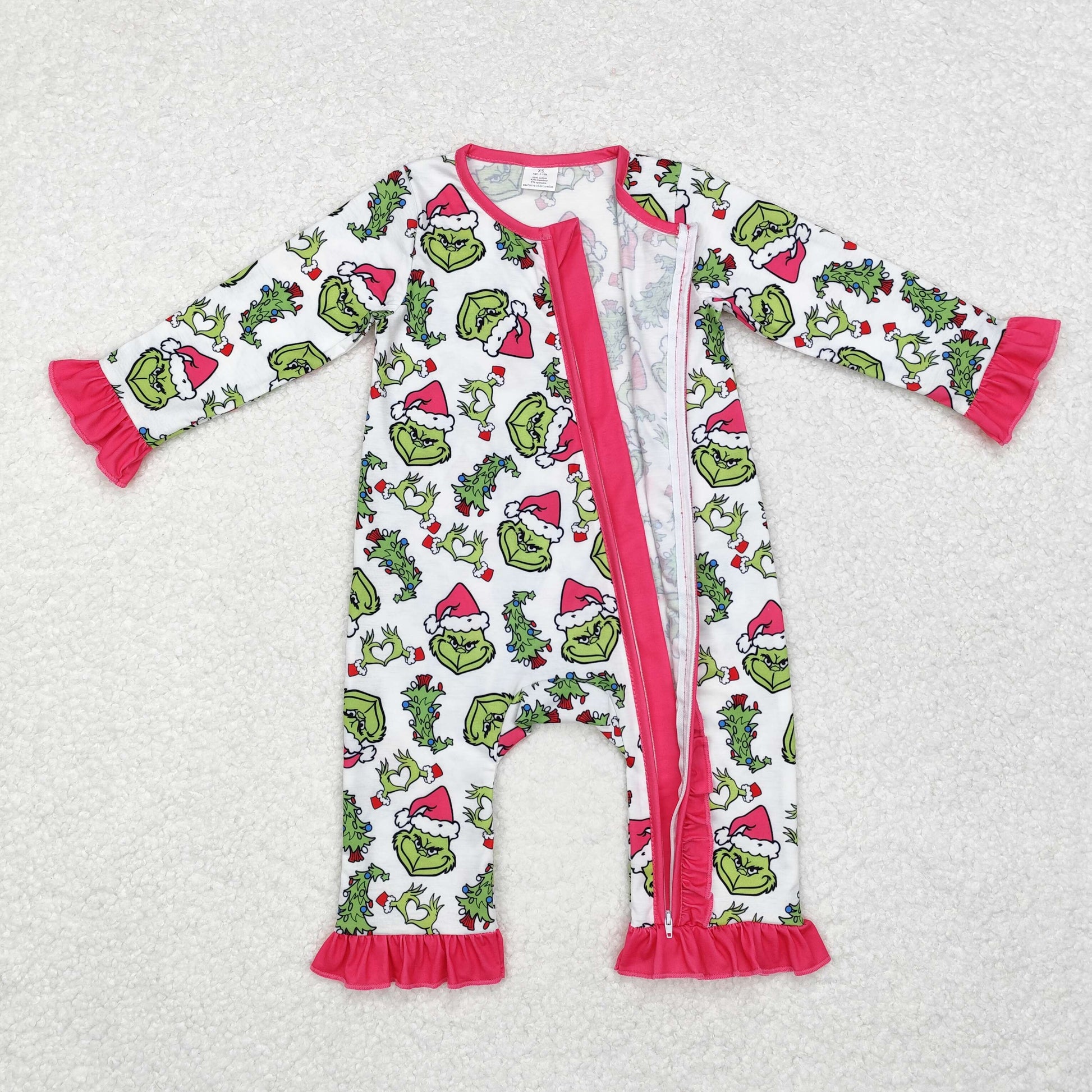 LR1337 Baby Infant Girls Pink Christmas Green Face Hearts Long Sleeve Ruffles Romper