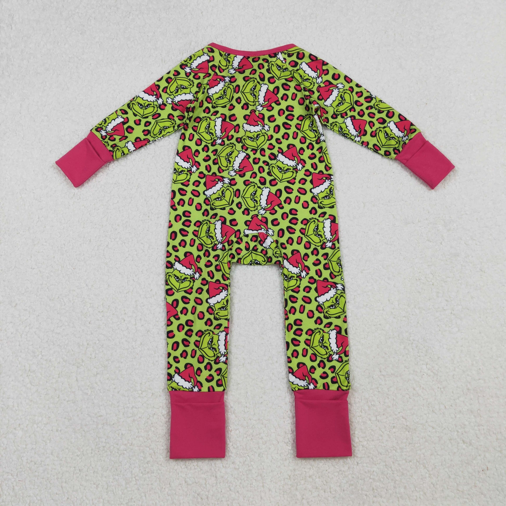 LR2520 Baby Girls Christmas Green Face Leopard Ruffle Zipper Footie Romper C10.14