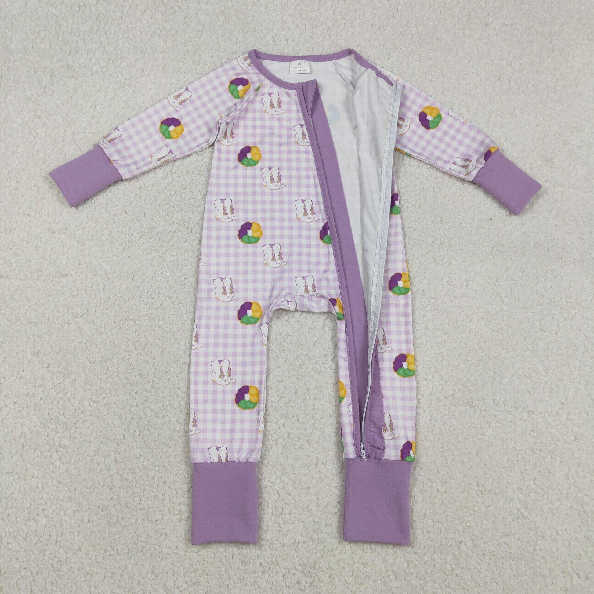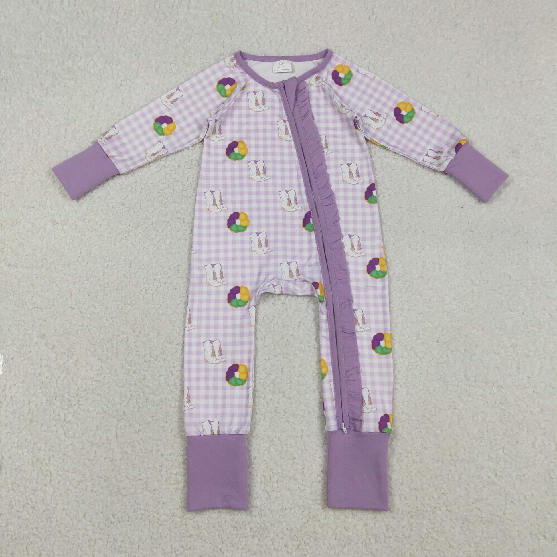 LR2783 Baby Girls Mardigras Boots Donuts Checked Two Way Ruffle Zip Convertible Romper C12.9