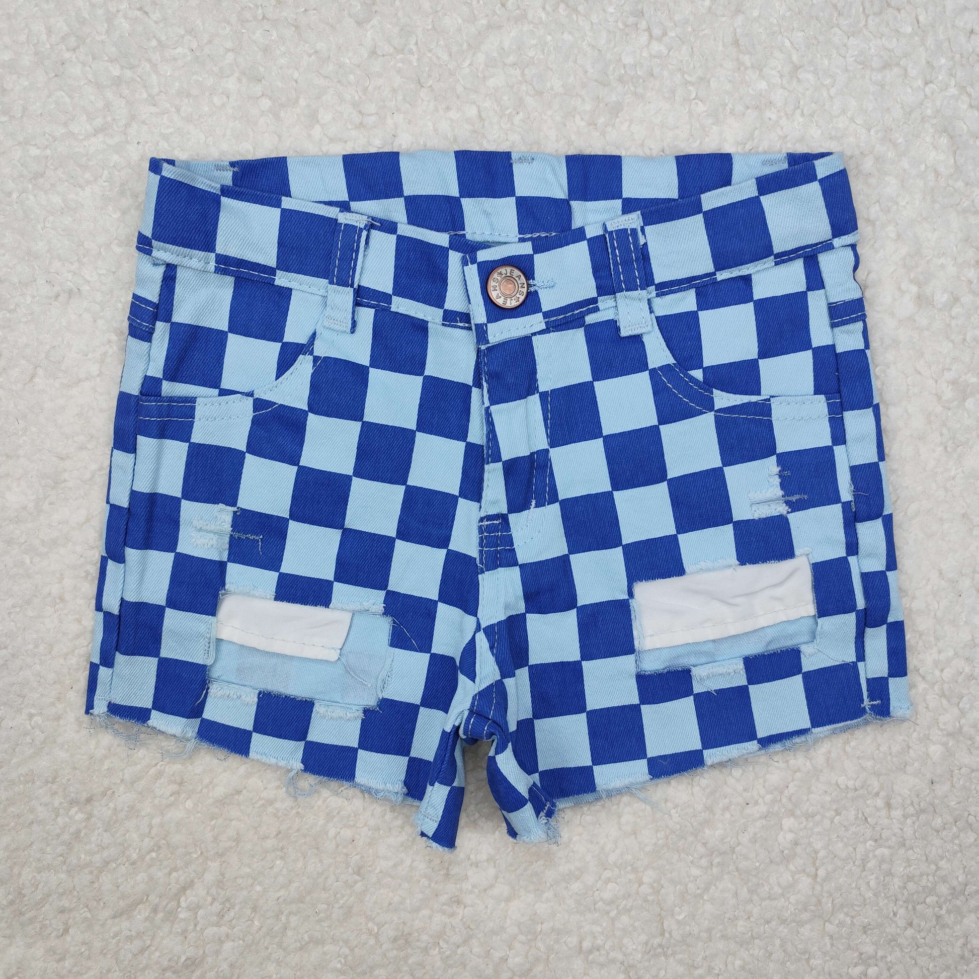 SS0093 Baby Girls Blue Checkered Distressed Denim Shorts