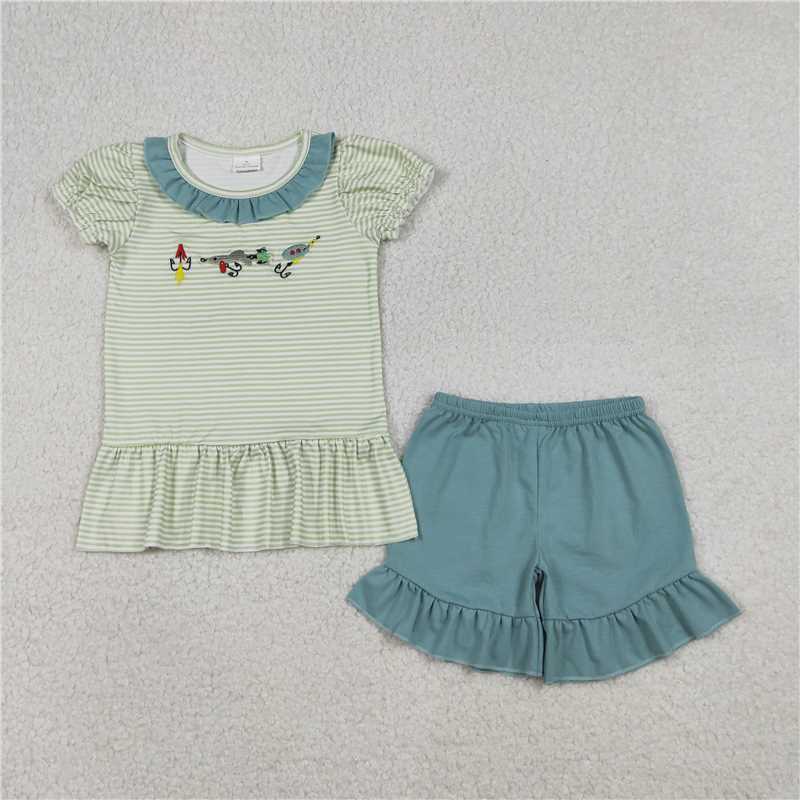 RTS GSSO2792 Embroidery Fishing Baby Girls Stripe Collar Tunic Ruffle Shorts Set Cute Hunting Theme Outfit for Little Girls