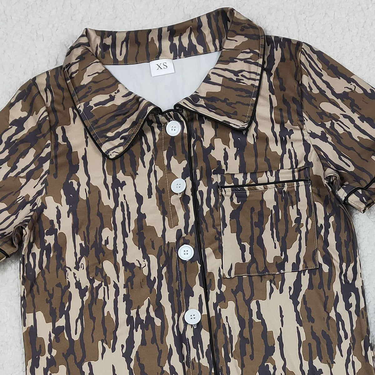 RTS GSSO3136 Adult Women Southern Olive Camo Button Pocket Top Ruffle Shorts Pajamas Set