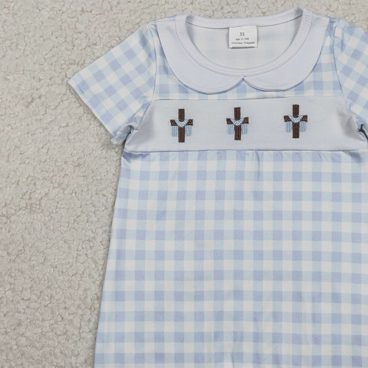 RTS SR3758 Embroidery Crosses Baby Boys Blue Checked Easter Collar Rompers