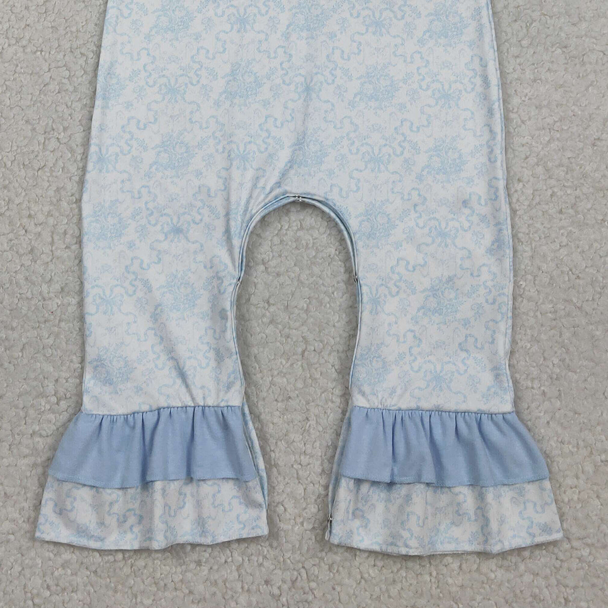 RTS SR3843 Embroidery Bows Baby Girls Sleeveless Blue Flowers Ruffle Rompers