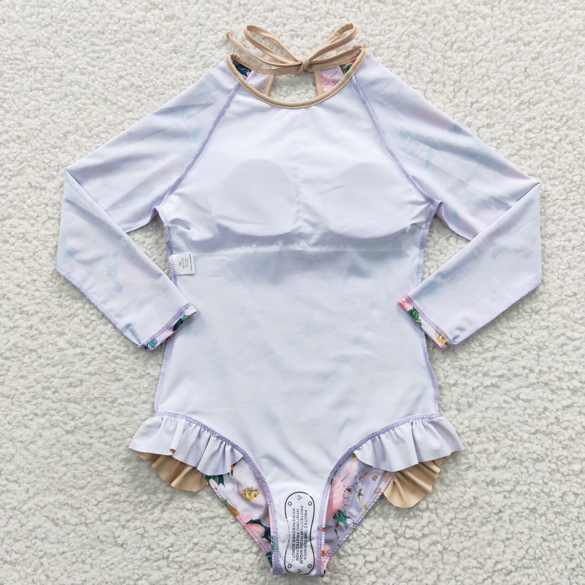 S0085 Long-sleeved One-piece Swimsuit with white flowersS0085 Long-sleeved One-piece Swimsuit with white flowers