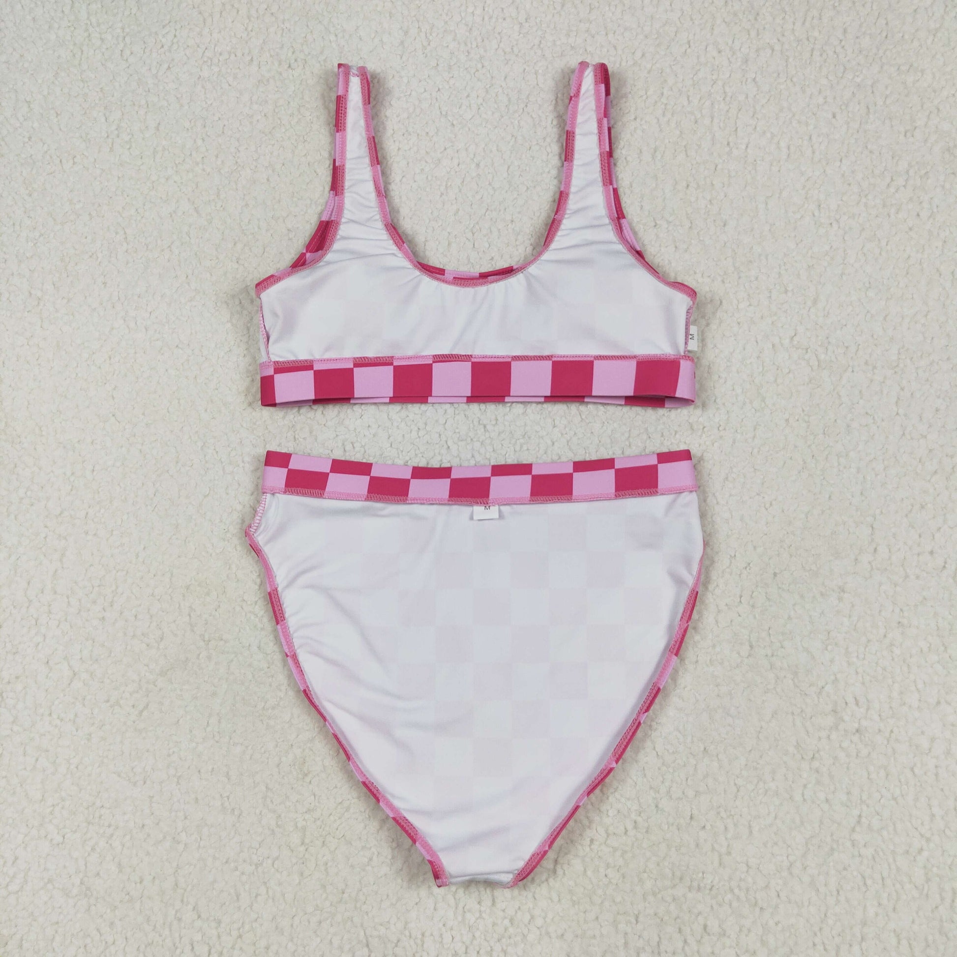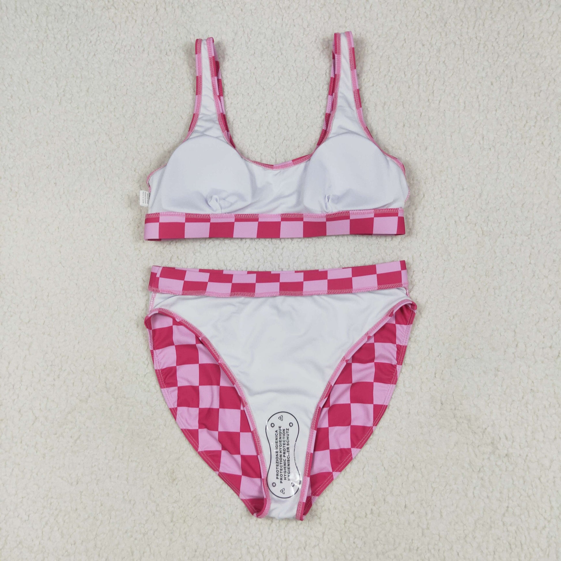 S0555 Adult Women Hot Pink Plaid Vest Top Bottom Swimsuits Set 6.13