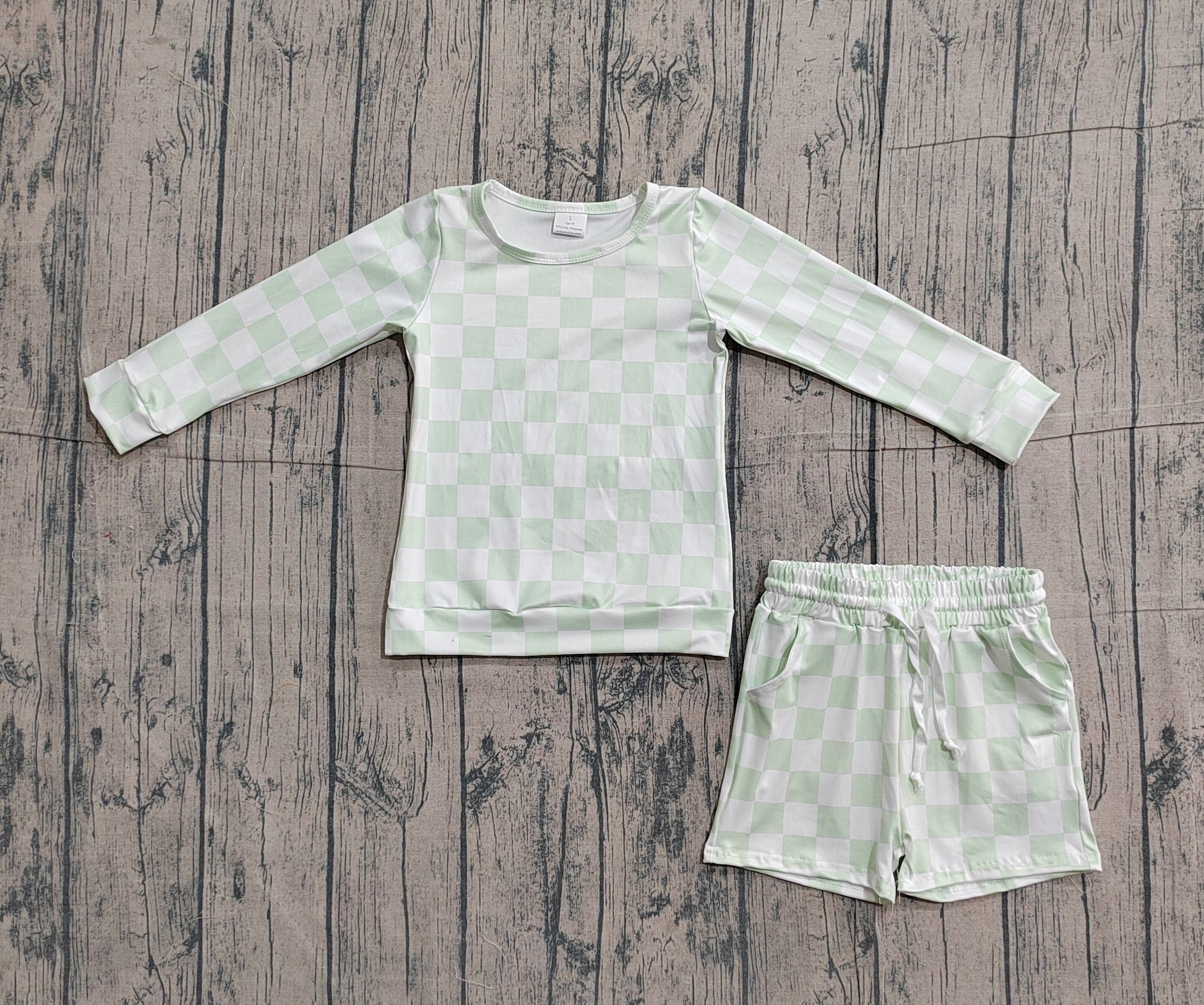 Sample GLS0086 Cute Baby Girls Light Green Checked Long Sleeve Top Pockets Shorts Clothes Sets