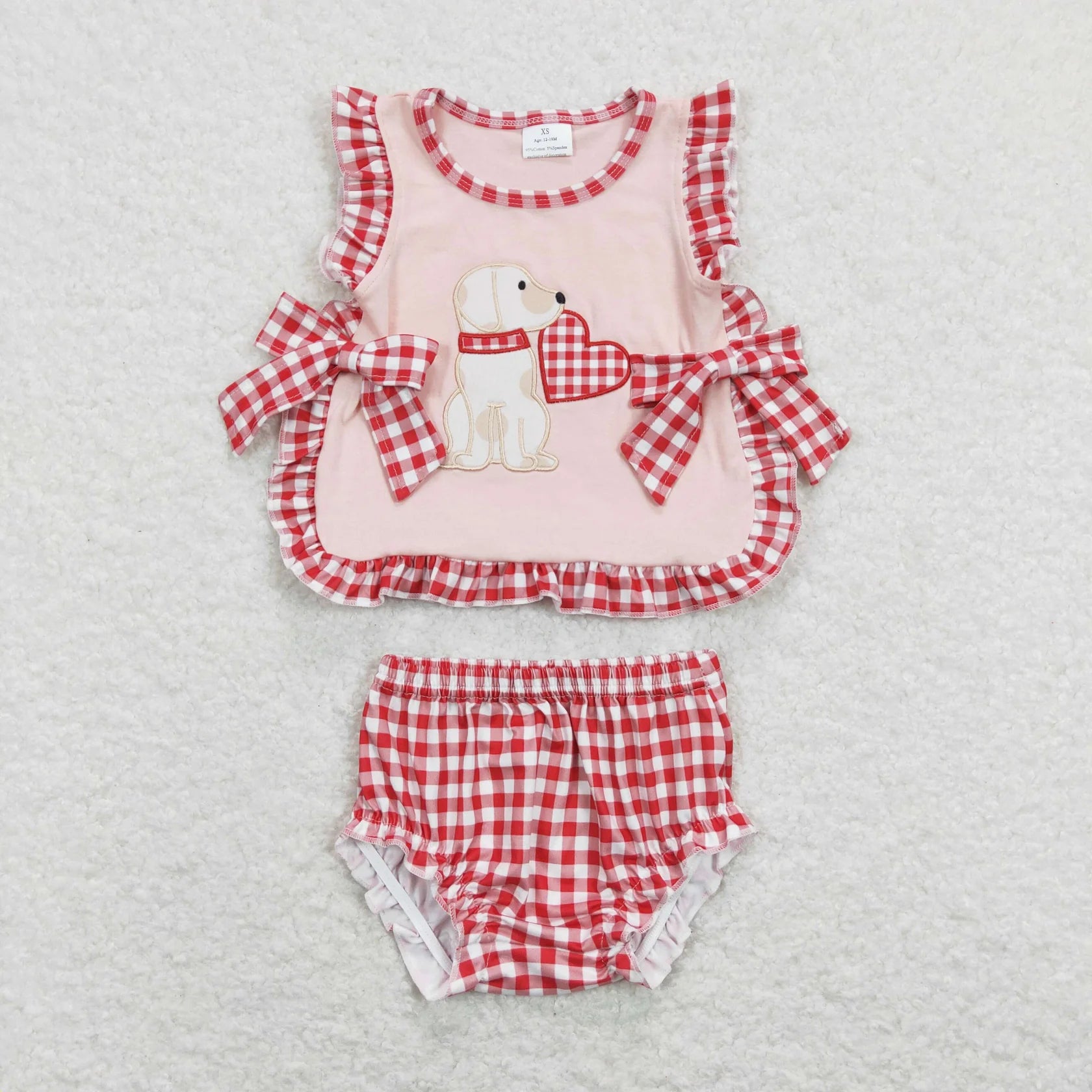 Sibling Baby Boys Girls Embroidery Heart Dogs Red Checked Pant Bummies Valentines Clothes Sets C11.29