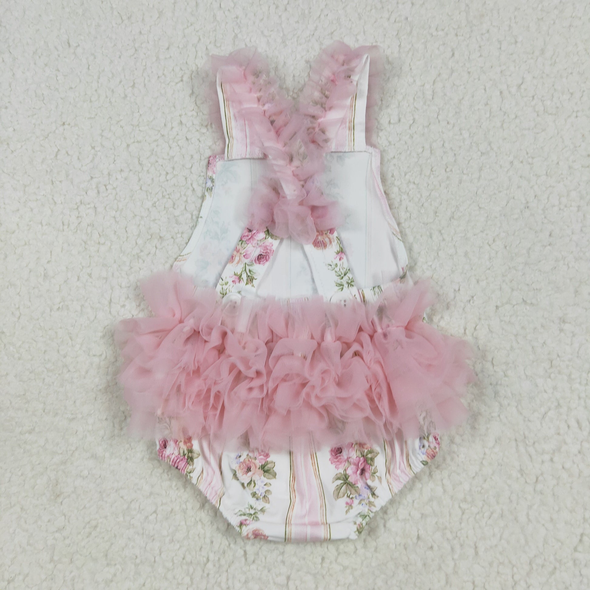 SR2964 Baby Infant Girls Pink Tulle Strap Floral Stripe Ruffle Romper 7.8