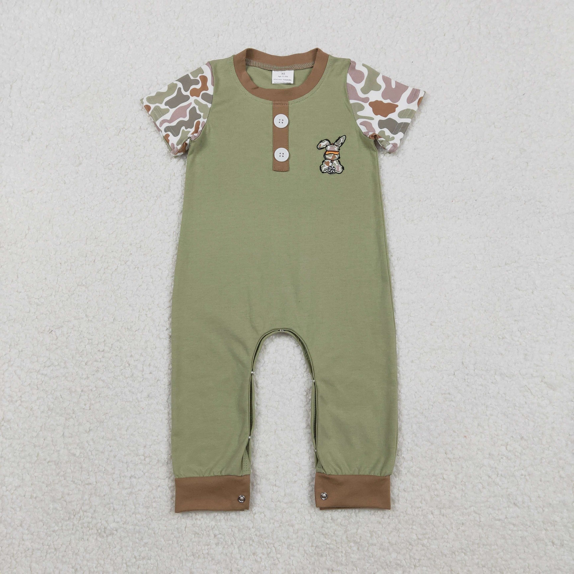 SR3258 Embroidery Baby Boys Olive Camo Rabbit Button Easter Footie Romper C11.21