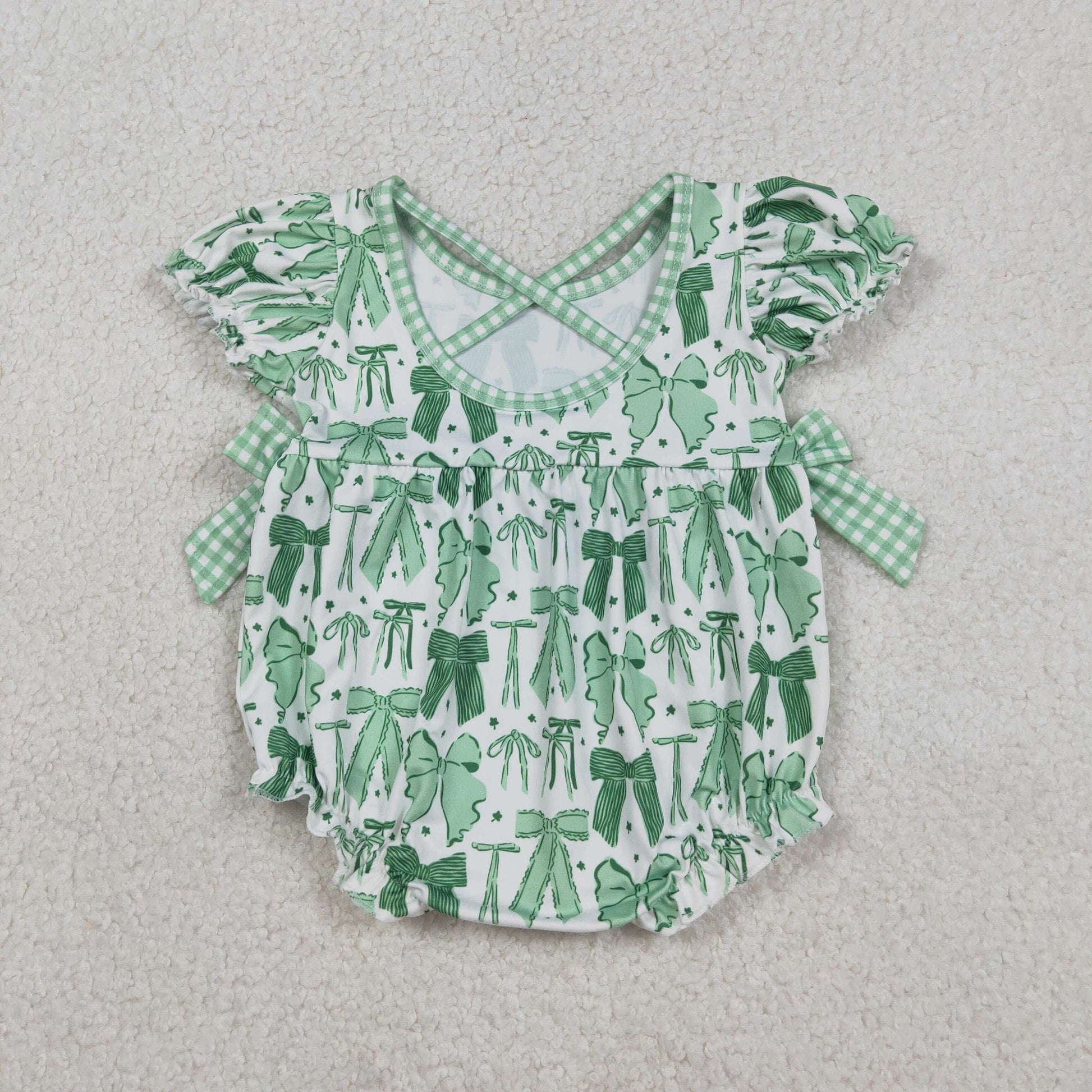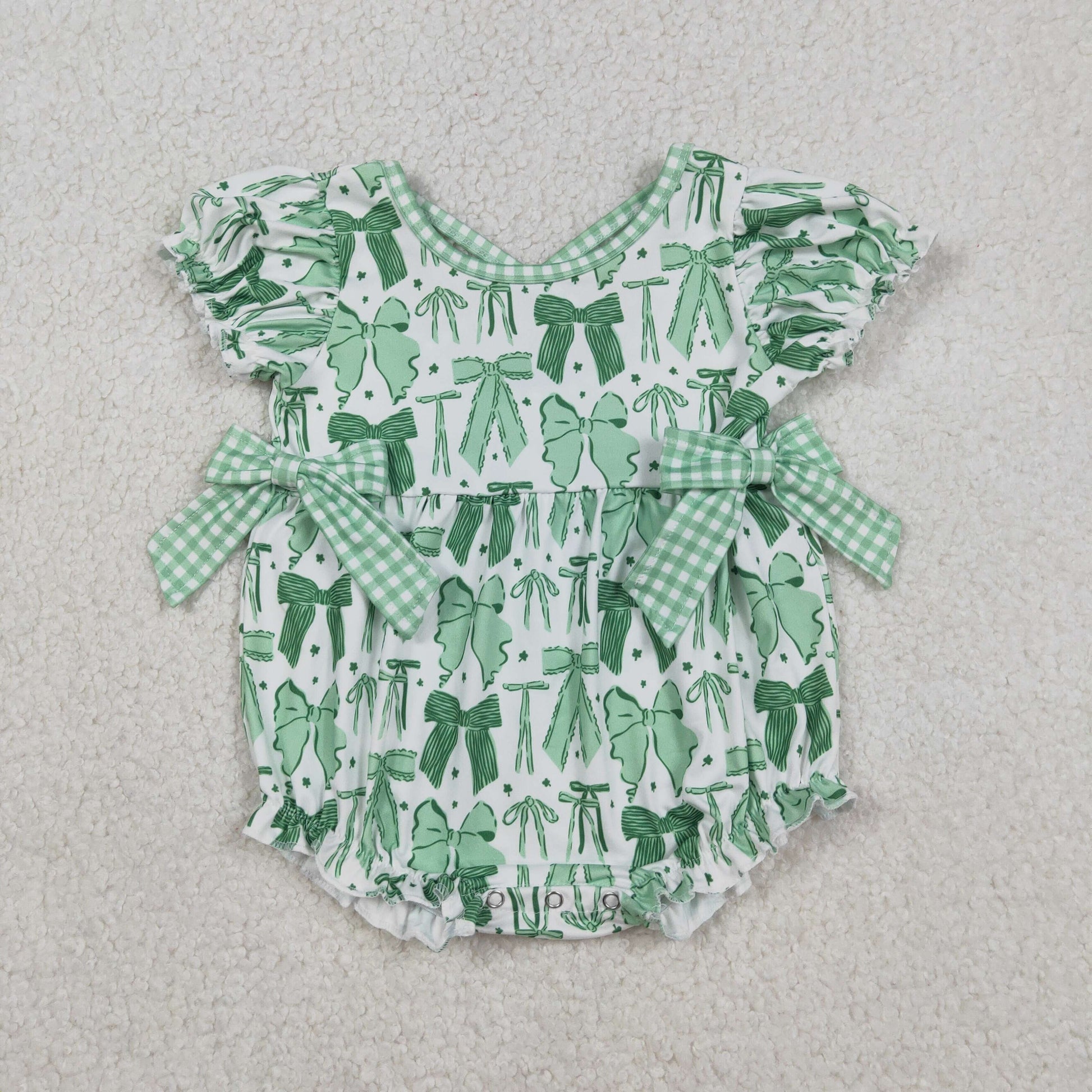 SR3305 Baby Girls Green Clovers St Patrick Bows Ruffle Rompers C12.13